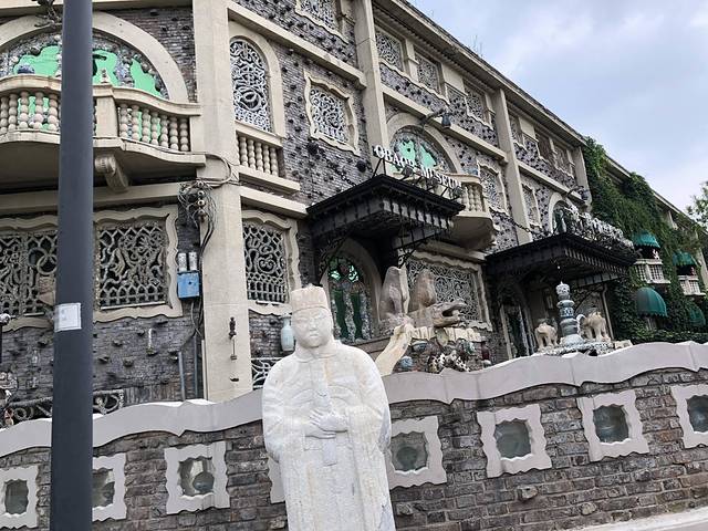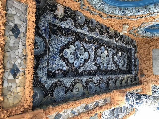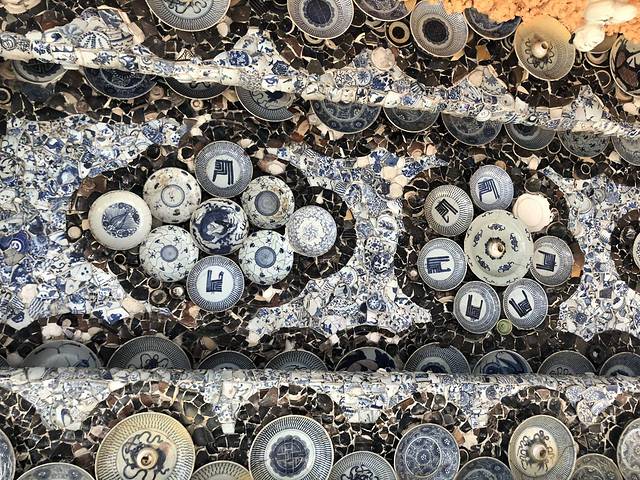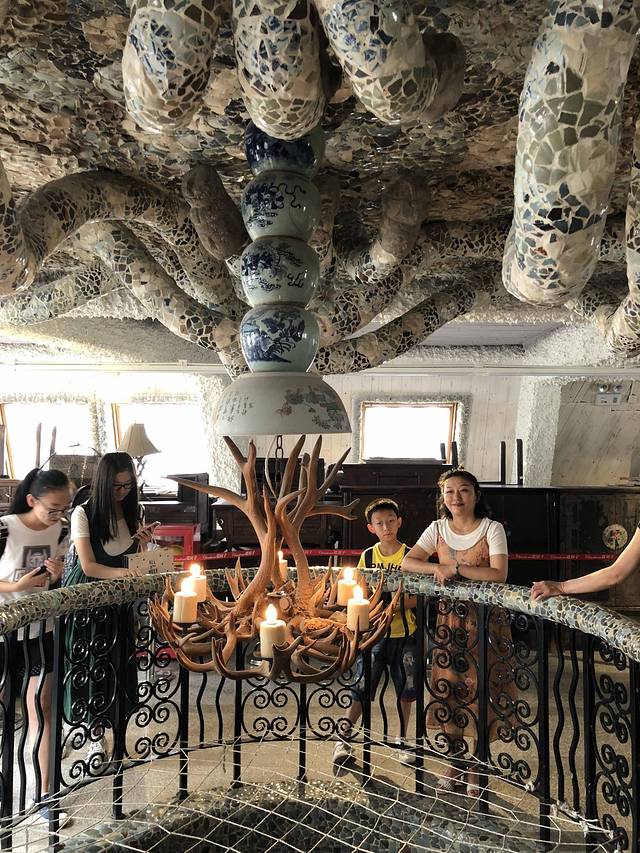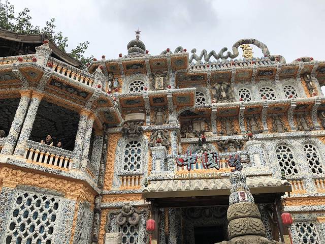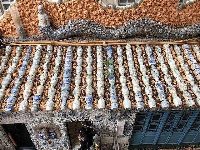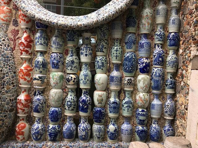 近十米长的外围墙上,整齐地镶着600多个瓷瓶子,大多都是青花瓷,“瓶”音同“平”,大概取的是平安(瓶安)之意吧。中国文化就是这么地有意思如果细看,还能看到各式瓷瓶与瓷瓶的缝隙之间,是用水晶石填充的。虽然有的水晶石貌似已经被人抠走了......
