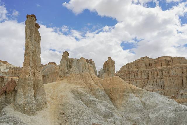 土林中的土柱也是形状各异,在这里只要你有足够的想象力,它就能成为一切你想象出来的东西的形状,其实霞义沟还有个名称叫“蘑菇林”,因为这里的石柱下方为黄土与沙砾,顶端却是含铁矿层,所以经过长时间的雨水冲刷,形成了上大下小的蘑菇状,它们就像是一顶顶帐篷如雨后春笋般的矗立在土林当中。