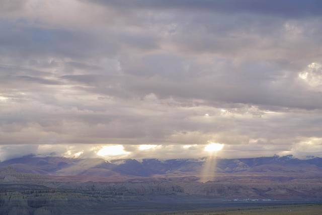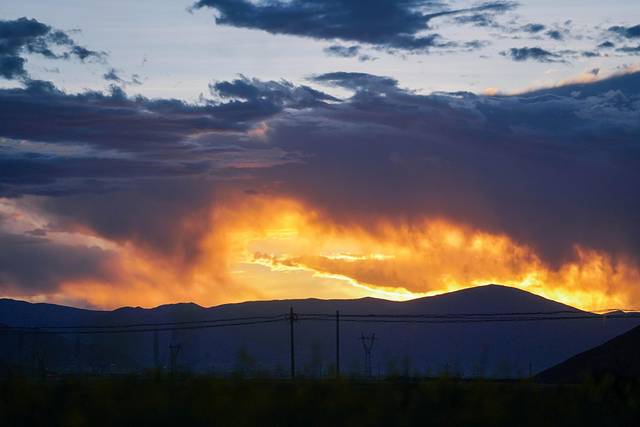 赶路的一整天,遇见了超美的晚霞瀑布,周围都是乌云,只有远处山尖的天空上红透了。