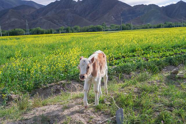 一路上都是油菜花田和青稞田作伴,车子停在一处加油站,我们趁着这十几分钟加油时间下车拍照。路旁的小牛成了一堆人的拍摄对象。