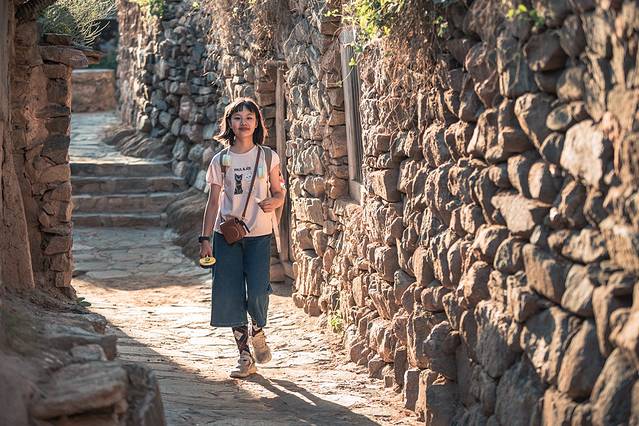 面前被夕阳照亮的一整面山坡上,层层叠叠、错落有致地分布一座座着由石头、夯土垒成的屋舍。墙基多为大块石头垒砌,其上的泥墙中则露出小一些的碎石块,果然是名副其实的石头村。