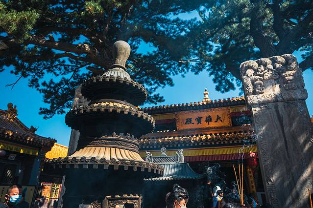 在台怀镇吃了顿素斋,民宿里小住一晚,第二天一大清早便起身先去参拜菩萨顶。五台山,由东、南、西、北、中五处山上平地组成,虽然纬度高,却生长着可供建材使用的大树,再加上当年的帝王力倡佛教,为建造山中古刹提供了绝佳环境——整个五台山的范围里,藏着大大小小上百座寺庙。