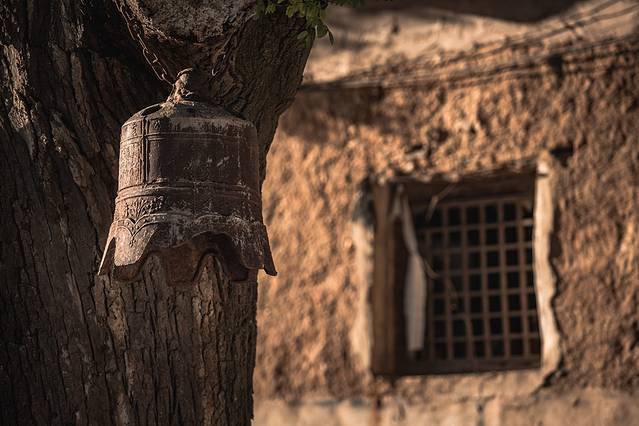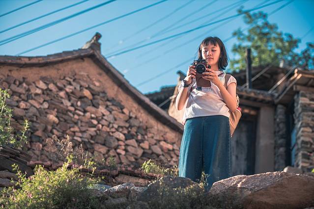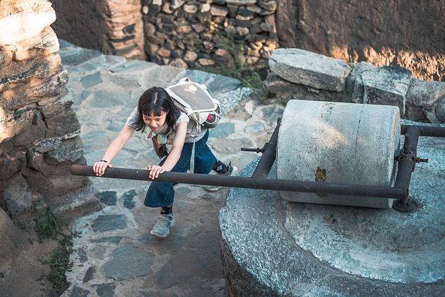 小孩子天生似乎就喜欢这样的山野乡村,布丁和叮当在村里爬高上低,玩得不亦乐乎。见到一个石磨盘,也要使出浑身力气,两人一起推上一圈又一圈。西沉的斜阳,用尽它最后的气力,将整个村子照得金灿灿的,时光此刻仿佛也慢了下来,将孩子们带着一圈金色轮廓光的欢快身影,永远定格在我的记忆里。