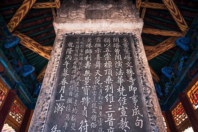 寺内天王殿、钟鼓楼、大文殊殿、大雄宝殿等建筑的屋顶,都被三彩琉璃瓦覆盖,在夏日的阳光下尤其显得金碧辉煌。东禅院当中的碑亭,耸立乾隆皇帝的御碑,汉、满、蒙、藏四种文字镌刻的碑文,讲述了菩萨顶的历史和乾隆皇帝朝拜五台山时的经历。