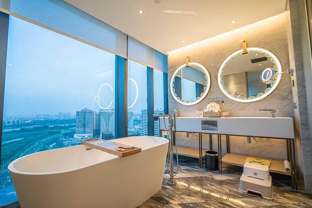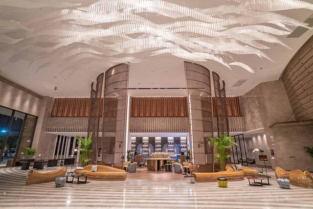亮相泉州,酒店在设计上充分的体现了泉州作为海上丝绸之路起点、世界遗产城市的海洋文化元素。大堂船仓形式的设计、观星吧、头顶如同海浪般的灯饰,还有闽南红砖的点缀和电梯内的壁画,都在讲述泉州向海而生的历史传统。