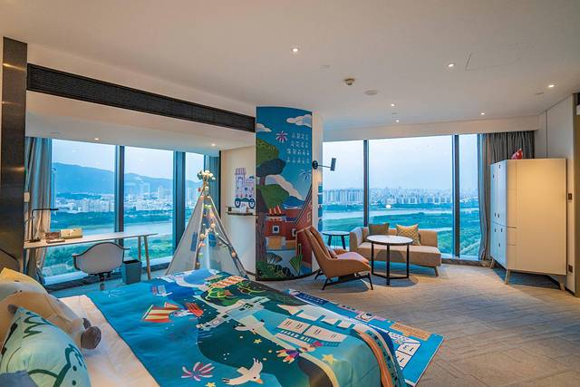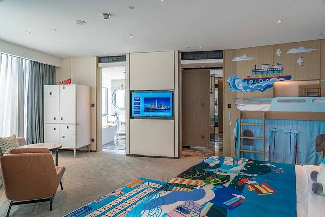 亲子客房和市面上很多大嘴猴、小黄鸭主题不同的是,这儿的亲子客房更像是一个泉州文化的研学基地,客房通过多种有趣的游戏向向小朋友讲述泉州的文化、泉州的建筑和泉州的古早味。客房内有备有小朋友的浴袍及专用洗漱用品,一张上下双层的儿童床铺恰巧满足了二胎家庭的需求。