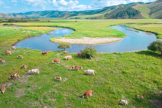 不冻河蜿蜒回转;沙洲浅滩草嫩树茂,牛羊马匹悠然自在……不需要思考,不需要构图,只要站在河畔,便能融入这画境之中!