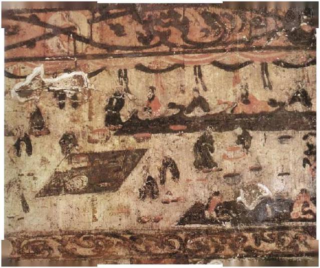 由于壁画毁坏较严重,在人群中找不到墓主人在那里。墓主人应该是画中最尊贵者,难道墓主人是画中底部骑马者?让人实在无法理解,因为一墓主人应该在画的中心位置;二