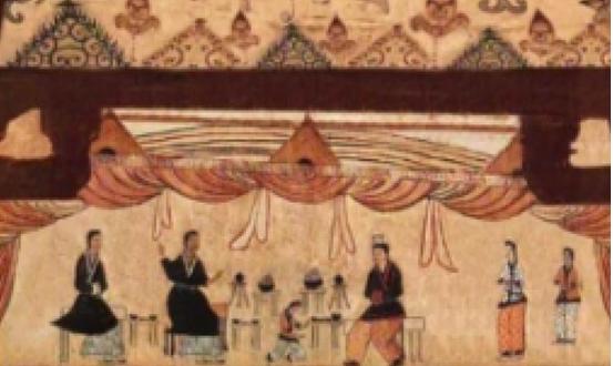《家居宴饮图》是目前发现的墓葬壁画较早的一个,多数学者认为画于四世纪中叶,画面为墓主人的宴饮图。壁画位于墓室的北壁正对着墓门,为墓室的主壁,墓顶绘日月星辰。甬道左壁绘门犬。主室前壁绘交柯大树。东壁画朱红色梁柱斗栱,其中斗拱是中国古代建筑中特有的形制,墓葬壁画又不能把整个房子都画在上面,用斗拱是代表在居室内,在屋内还有一个装饰帷幔,帷幔下面还有打结的四条长长的飘带,颜色已经看不清,当时颜色应该是鲜艳的。居室中有一面部脱落较严重的男主人坐像,男主人居中,男主人双手叠放在胸前,双腿叉开,一脸庄重,在男主人左侧,还有一人难以分辨,男主人身后是台灯或熏香。一侧有两女子垂首跪坐,双手合抱胸前,朝向墓主人,左侧有2妇人列坐,应为妻妾,面前各设小几,旁有侍女各3人。手持巾具的男女侍从和厨房及上菜食者表现出贵族饮食生活。面对两个女主人的图案,其中一个为跪坐姿,后面的人物形象依次向下排列,有女侍、有男侍。在每个主人的旁边都有一个三足几,类似今天日常所用茶几,侍从在给主人送食物时也端着茶几,几的腿为动物蹄的造型,也叫兽蹄足几,上面放着盛食物的。两个主人坐的也是兽蹄足的几,东壁和北壁的壁画的一个过渡连接的过程,图中两个侍女,前面的侍女是直接端着几过来,几上放的盛食物,后面这个侍女端的就是一个盘,这幅墓葬壁画的生活场景其实是一个动态的。不是很呆板,墓主人对饮或对坐的这种宴饮形象,在中国的墓葬画中是比较常见的一个题材。