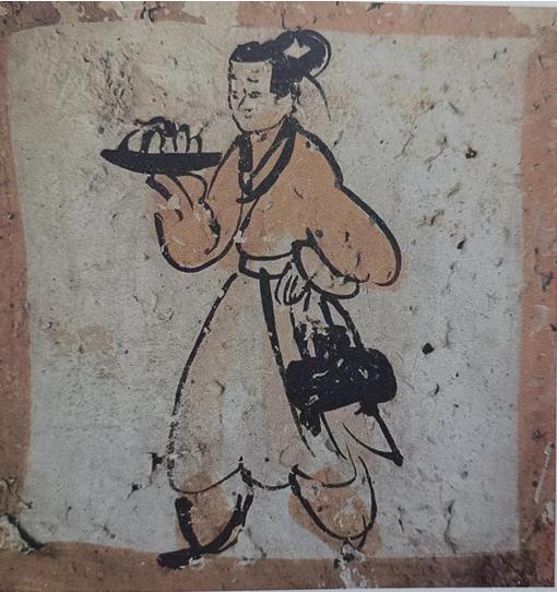 在主人面前至少有八名侍者排成一排,等待主人有召唤,其排场实在不一般。现存只能看得见侍者的头部,看不清他们手中拿着什么。