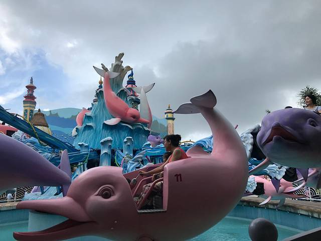 从右侧玩起,先来到海豚湾。这里有5D电影院,海豚转转车,旋转水战,还有中华白海豚馆。