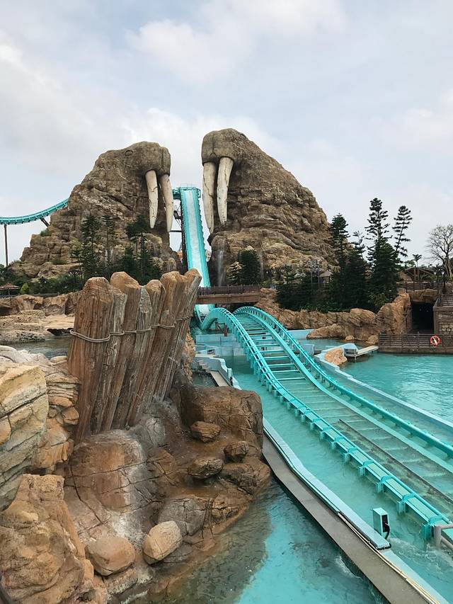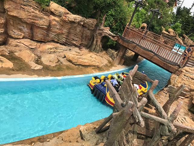 经过海洋大街,左侧是海象山,有一个昊昊以为的轨道车,就是超级激流。穿上一次性雨衣,我们坐上了轨道车,车先随着水流慢慢前行,经过海象隧道。到达水流的尽头,车沿着轨道向上爬升,我已经开始害怕了,那种突然下冲上升的感觉。