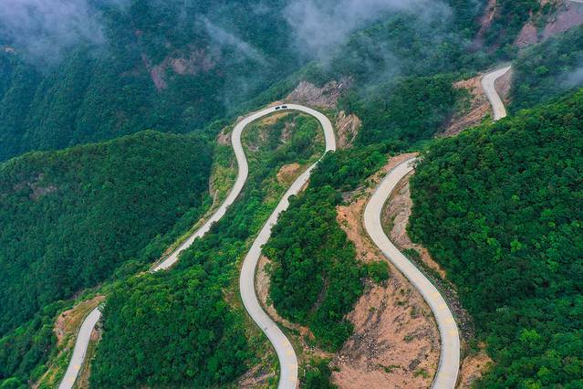 每到四五月间岭上映山红争芳斗艳,灿如云霞。这次自驾来到这里正好遇到下雨,云雾缭绕,景色美如画,公路盘山而上,在云雾中穿梭,仿佛来到了一个绿色的森林世界般,自驾的路上会遇到各种各样的美景,车停在路边停车场,站在红岭公路上往下去,远处云雾缭绕,群山众岭,梦幻。