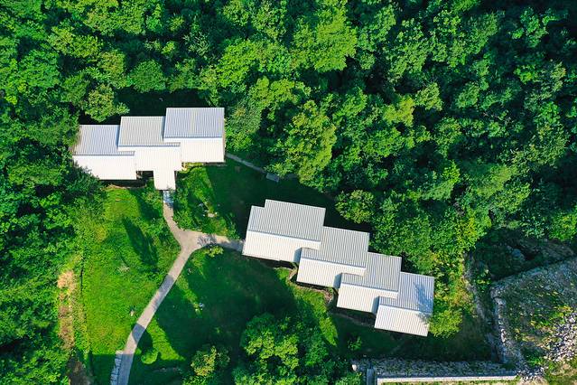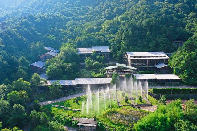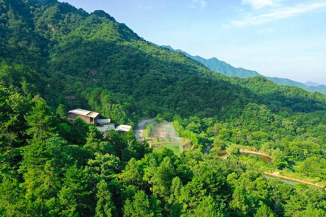 整个建筑群依势造景,还以原貌,利用自然、错落有致。整个山庄是在半山上,从无人机的视角看,整个度假村三面环山,周围被树林覆盖,度美炎炎夏日来到这里凉快了不少。