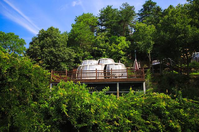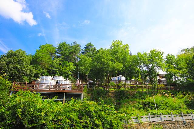 大别山庄度假村坐落在大别山主峰白马尖海拔950米处,自驾大别山风景道当天来到这里住宿,来到这里仿佛是来到了世外 桃源 一样,这里远离城市的喧闹,这里的建筑依山而建,因此在这里看到的是建筑物和天然物的融为一体,树从屋顶穿越,石从墙中生长,水从房中潺流。