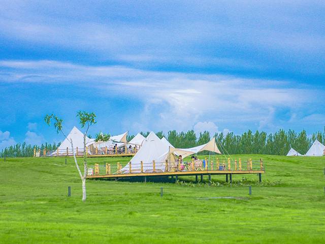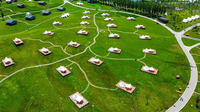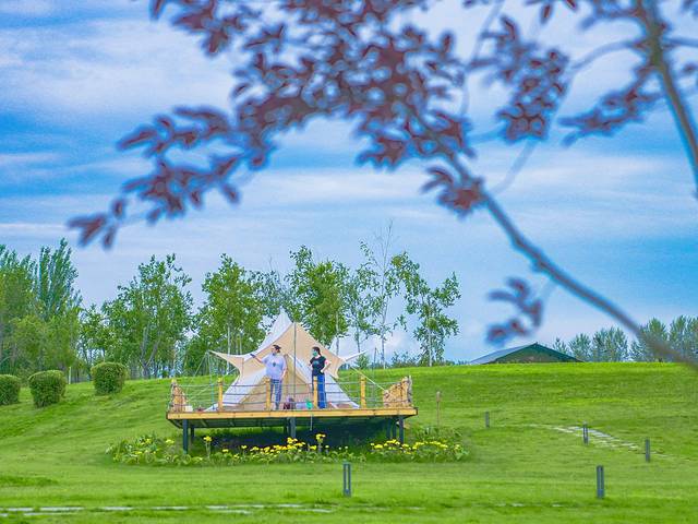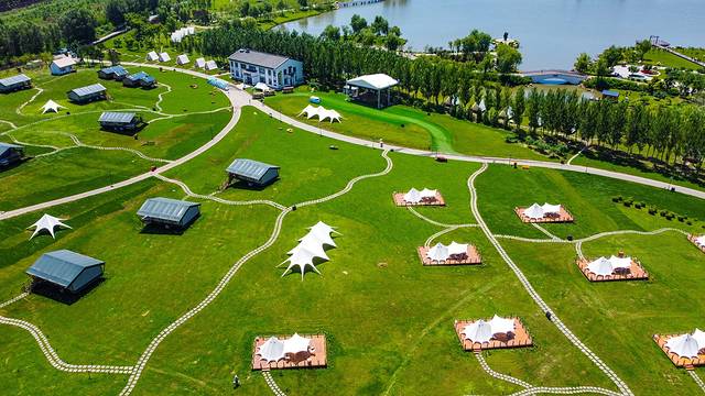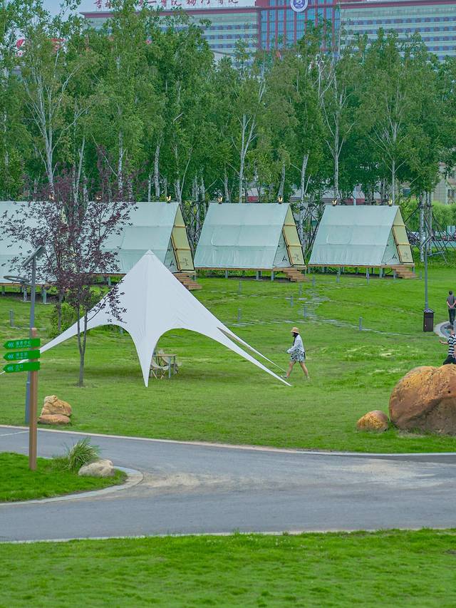 坐拥海龙湖得天独厚的自然景观资源,在大一片草坪和缓坡上,搭起了十余个不同类型和风格的帐篷。
