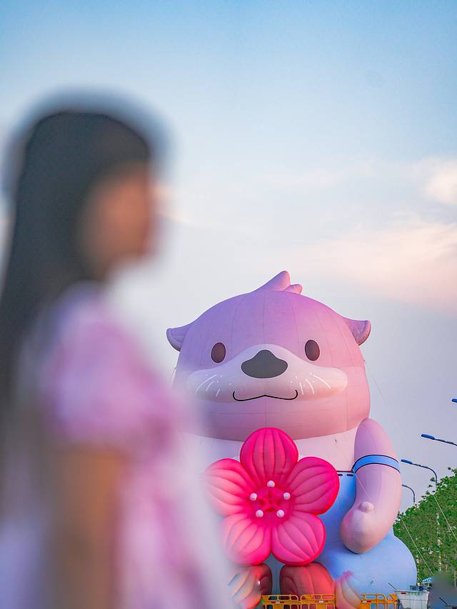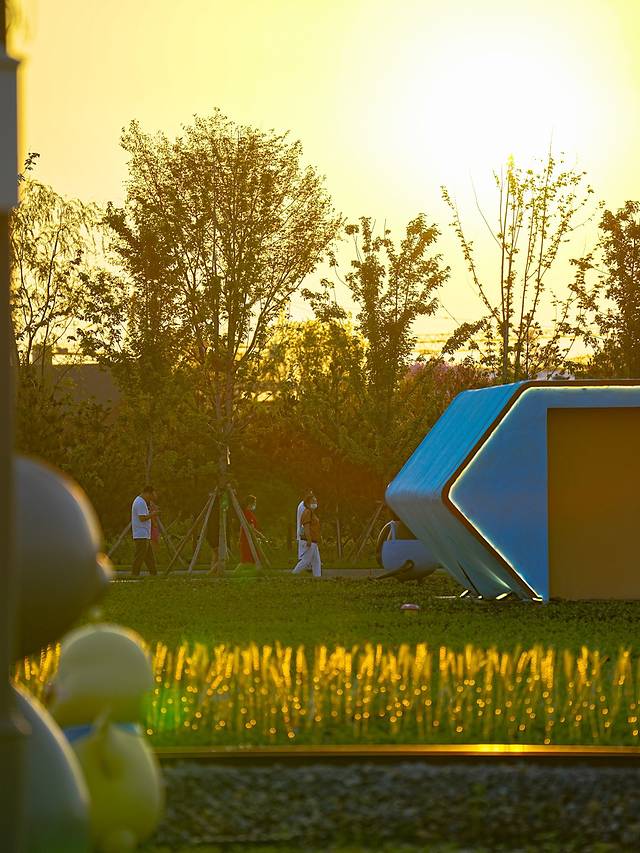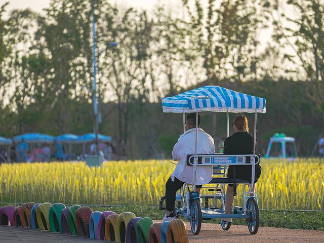 如果时间充裕,还可以扫码一辆共享单车,慢慢骑行在花海之中。正值傍晚的落日时分,金黄色的余晖将天空和万物撒上一层金黄。