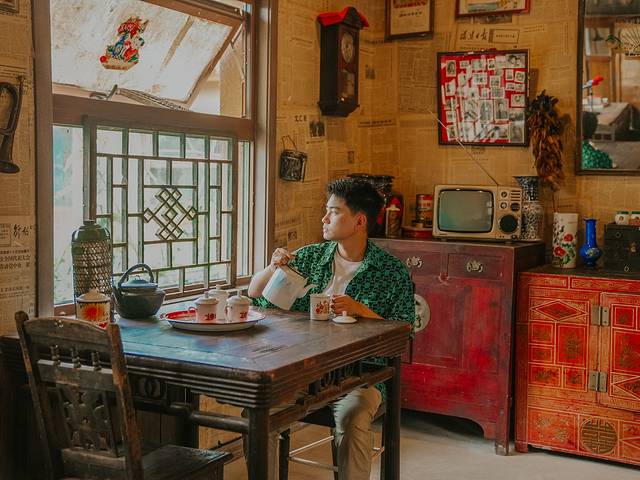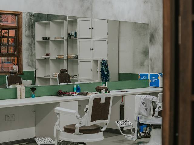 走到知北村理发店门口,复古的小曲在莺莺的放着,走进理发店里就是绿墙白座的经典复古配色。