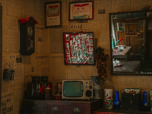 走进村长家,就仿佛穿越了时空的大门,过去东北人家的院落实景还原,屋子里用报纸糊满的墙壁,挂满了奖状和老照片。黑白电视机里咿咿呀呀的放着戏曲的声调,桌上搪瓷杯里的茶水泡的发黄。