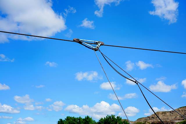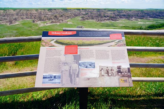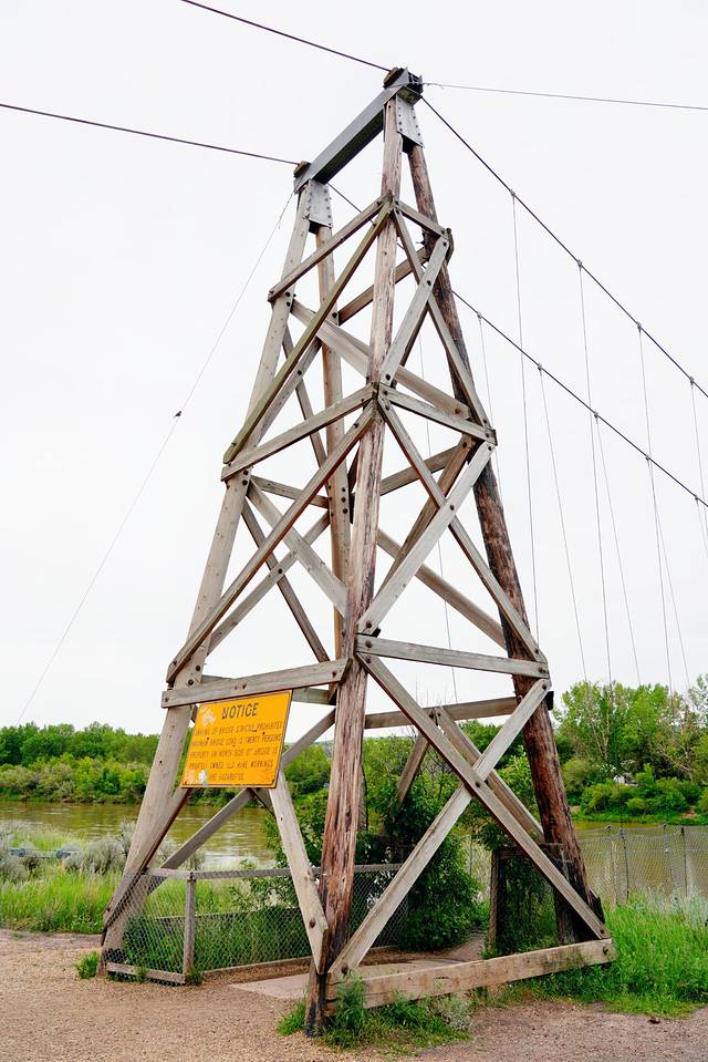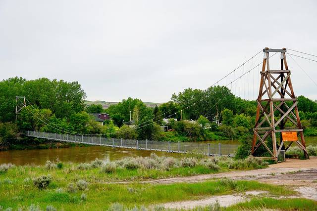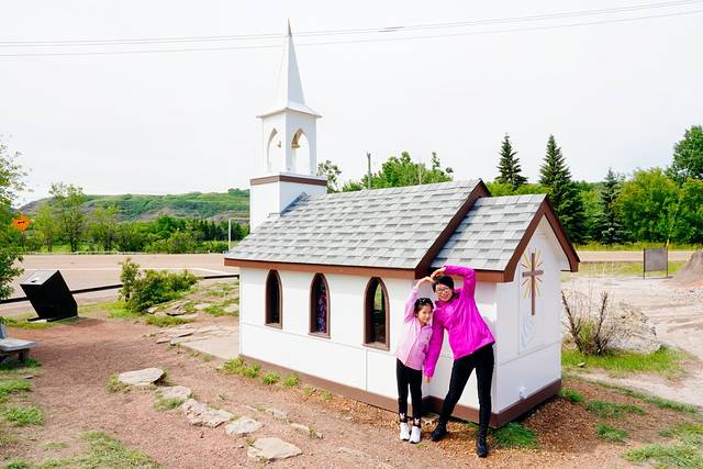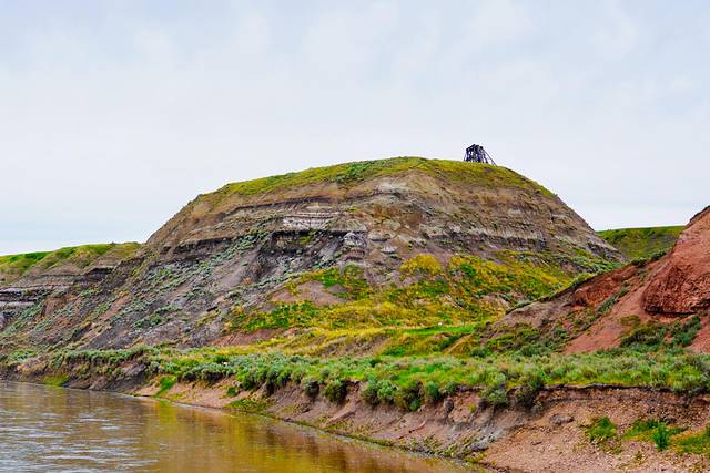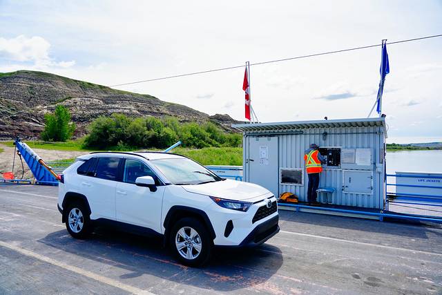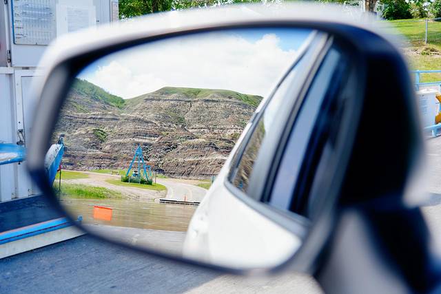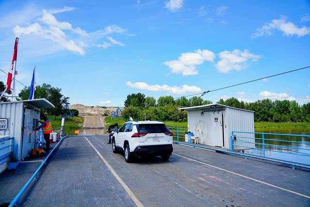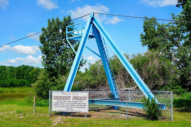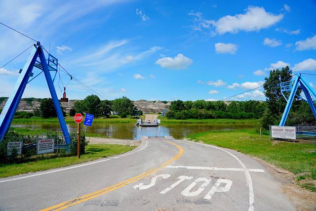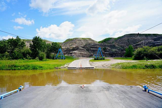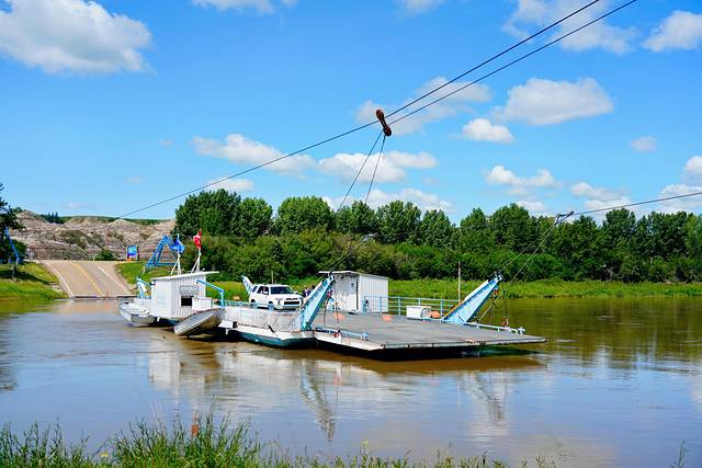 ★回到838号公路,继续向北行进约25公里,乘搭缆索操纵的布莱里奥特渡轮(Bleriot Ferry)(艾伯塔现存的少量缆索渡轮之一)渡过红鹿河(Red Deer River)。
