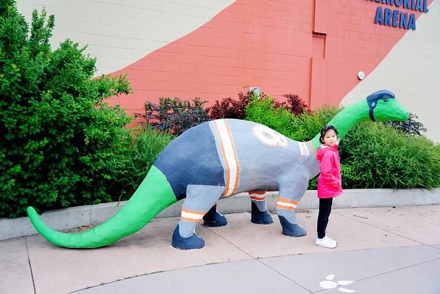恐龙小镇当然少不了恐龙元素,大街小巷、体育馆外、商店门口甚至居民家的草坪上随处可见形态各异、萌态可掬、色彩绚丽的恐龙。