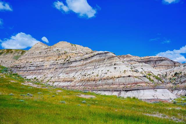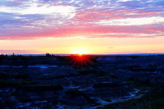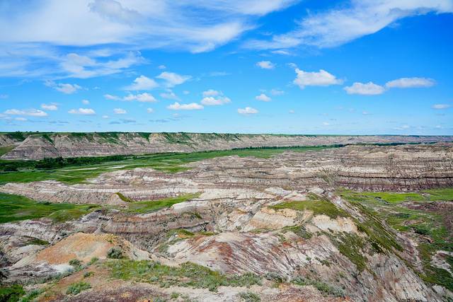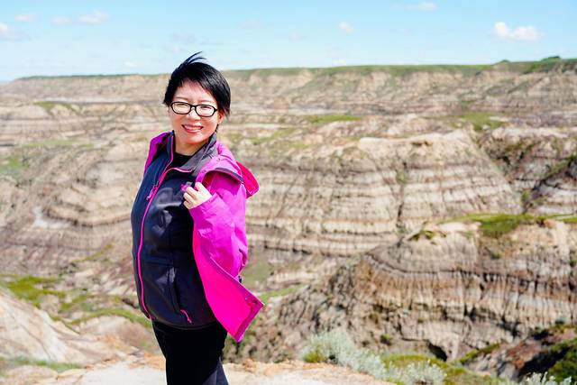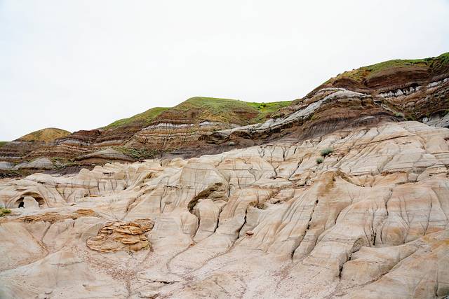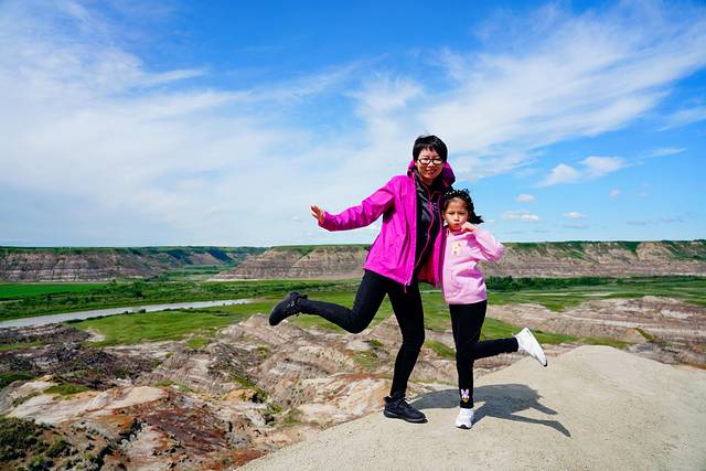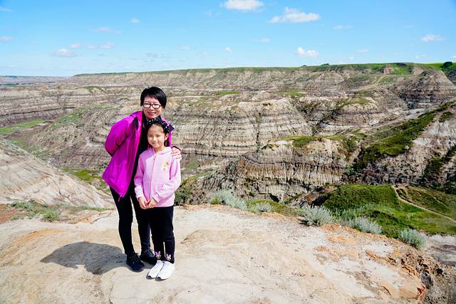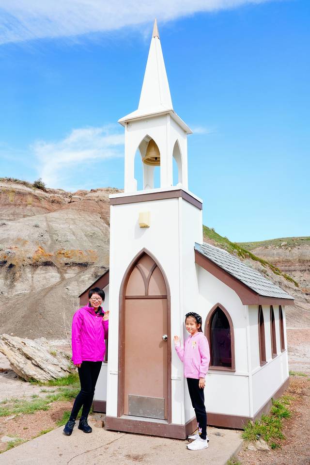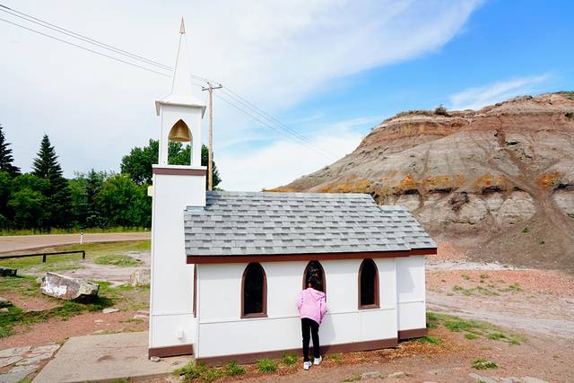 随着目的地德兰赫勒的逐渐临近,公路两边的大草原渐渐地被连绵不断的带状栗色群山取代,这些小山山脊干涸,寸草不生,裸露的岩石层次分明,这样的场景让我们感觉仿佛行驶在火星表面进入了另一个次元。这里就是艾伯塔东南部令人惊叹的恶地,曾经的恐龙天堂,如今的全球三大恐龙化石发掘地之一,也是好莱坞电影制作人最喜欢的布景地之一。