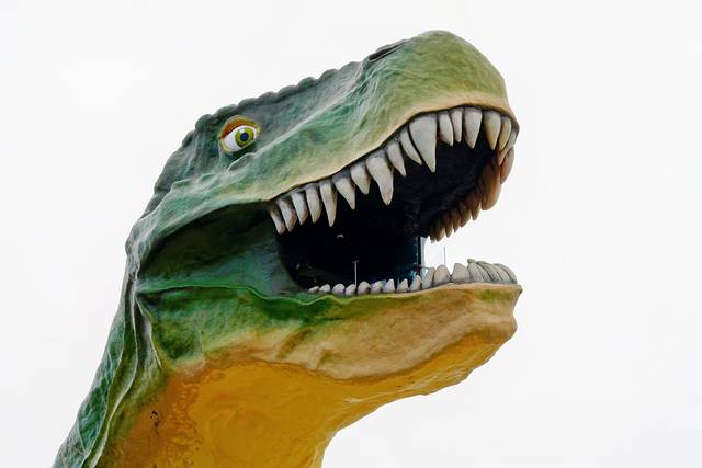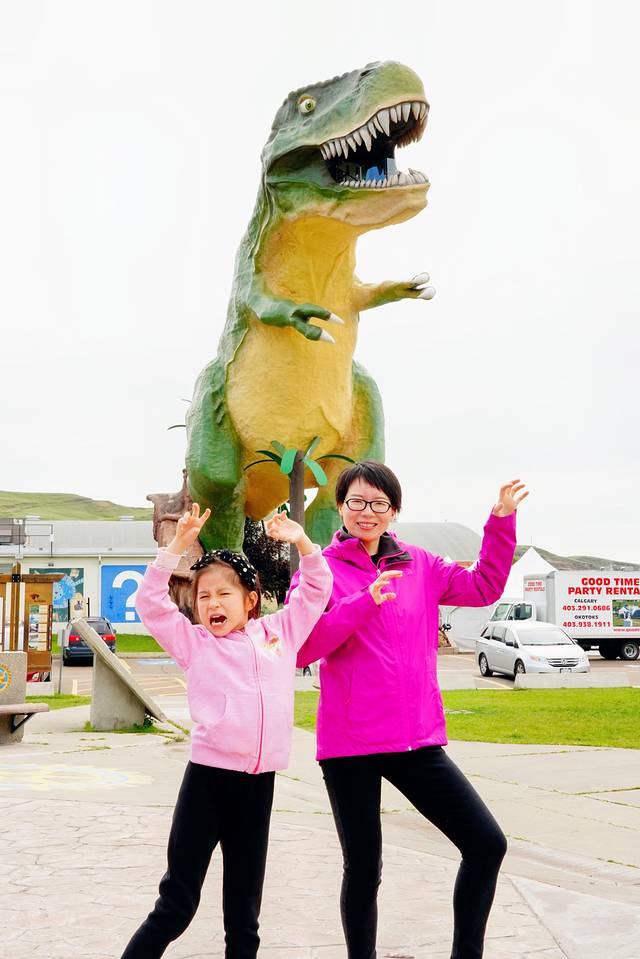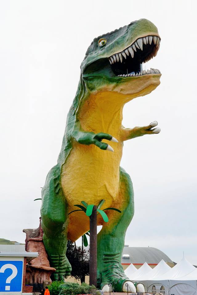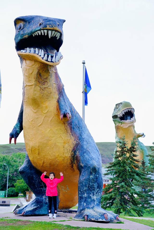 ★参观镇上游客信息中心旁的世界上最大的恐龙。爬到恐龙身体里,透过它张开的大嘴饱览恶地全貌。