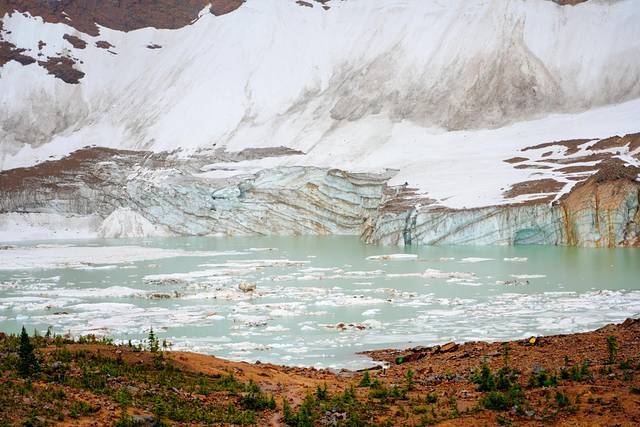 在观景台可以俯瞰卡维尔池塘(Cavell Pond)和卡维尔冰川(Cavell Glacier)的冰层。