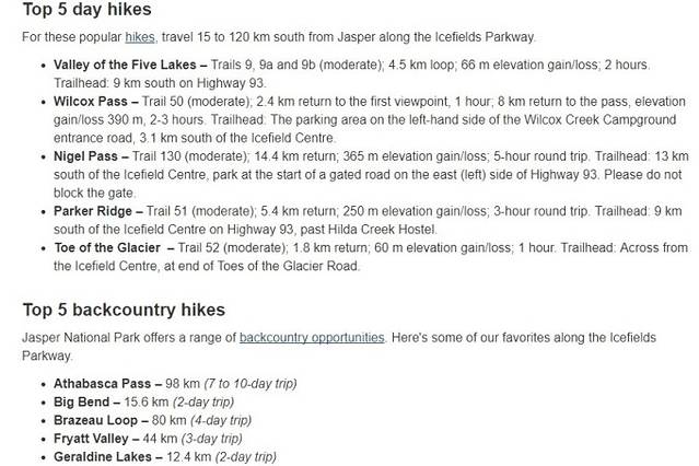 相较四、五年前纯粹用眼睛去观察世界的旅行方式,如今的我更愿意用脚步去丈量世界。由于加拿大公园的管理水平、徒步路线的丰富性、成熟性和完善性都堪称世界一流,所以这次行程安排中特地穿插了一些世界级的徒步路线,主要有: