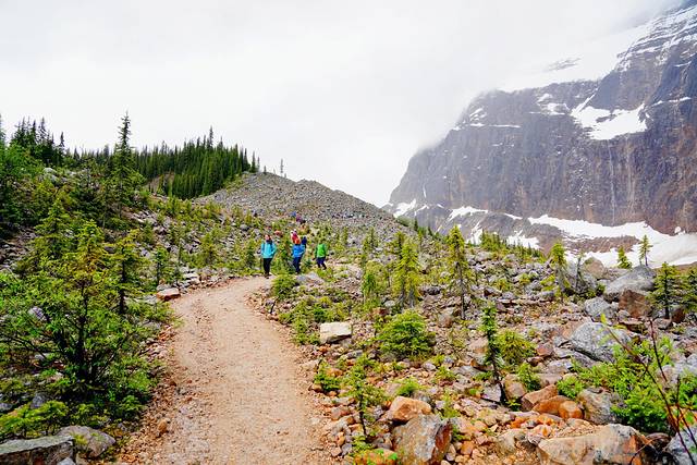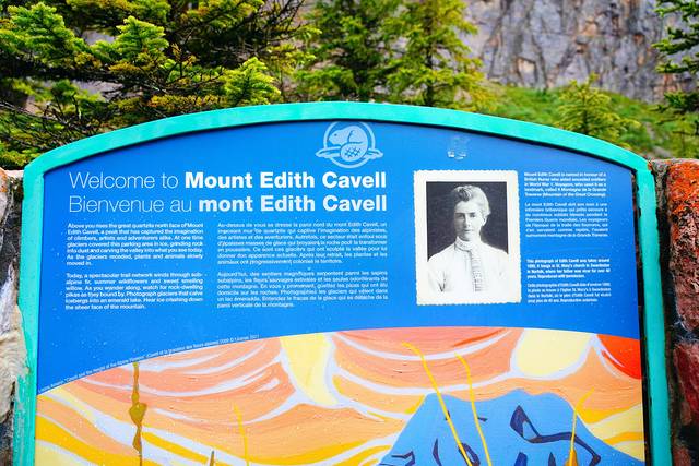 冰川小径步道是伊迪丝·卡维尔山北麓最受欢迎的一条徒步路线,只需跟随步道行进一点点距离就可以欣赏卡维尔山的壮美景色。Trail全程往返1.2公里,海拔落差70米,大约需要1个小时。从停车场出发,首先映入眼帘的是一块介绍伊迪丝·卡维尔事迹的展板,然后走一小段楼梯上到步道起点。