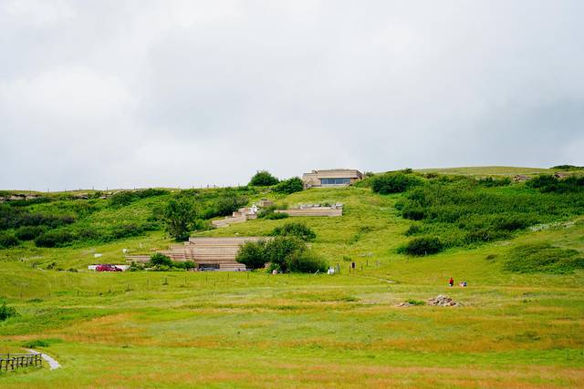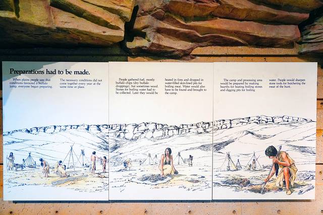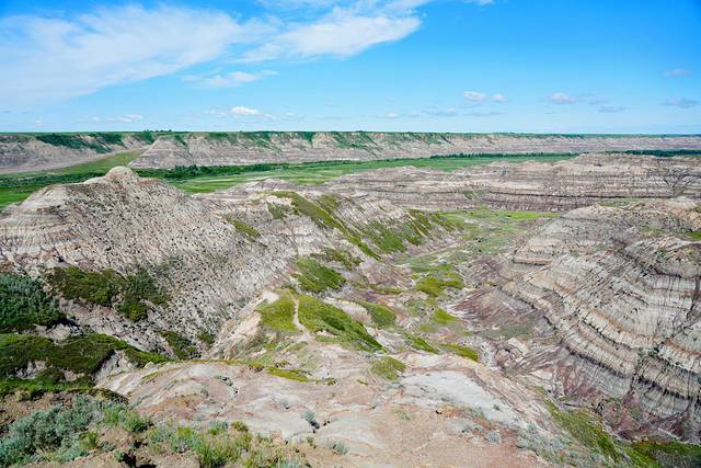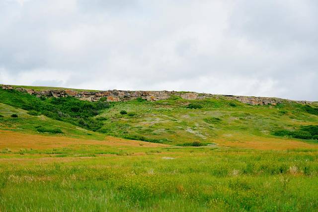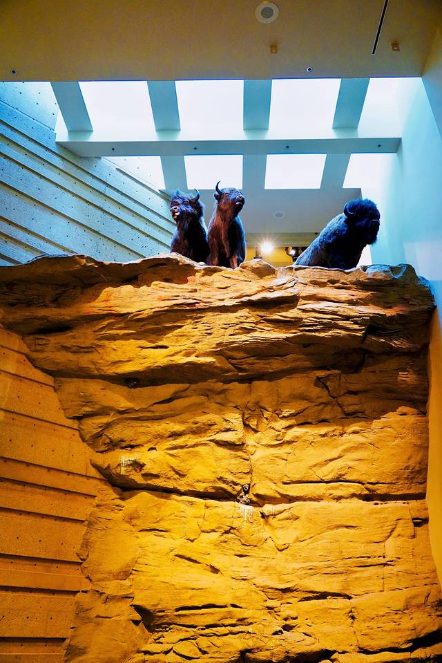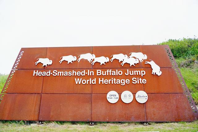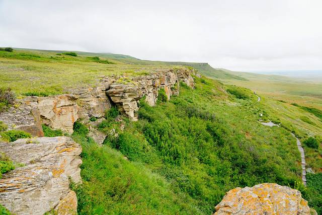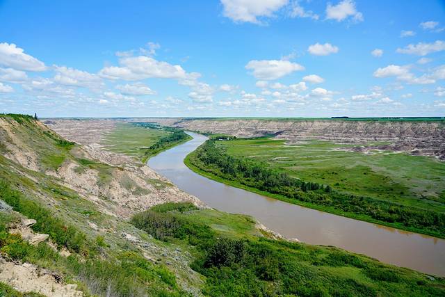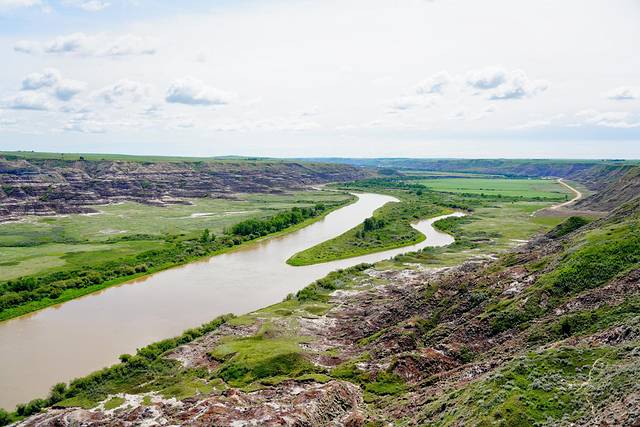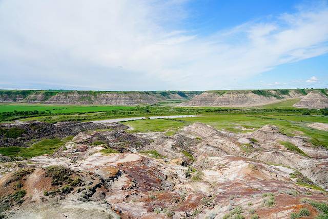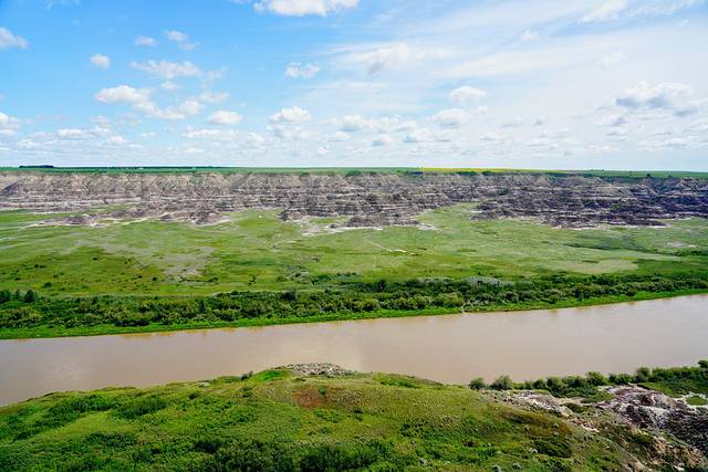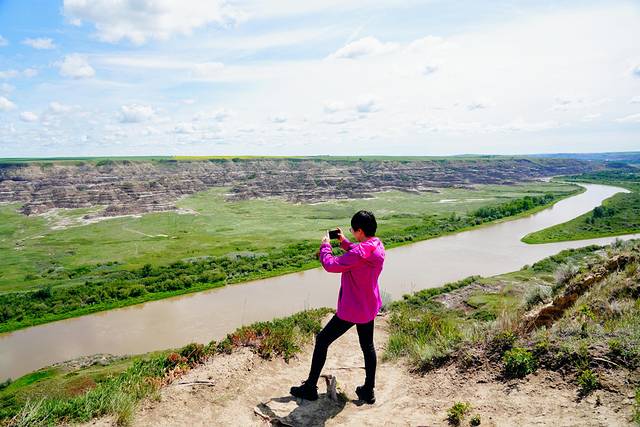 远眺右侧的红鹿河谷,景色也是异常壮美。开阔无垠的荒原,从落基山脉(Rocky Mountains)倾泻而下的红鹿河穿过其间,缓缓蜿蜒至远方。为了一睹美景,攀爬一百多级台阶还是值得的。