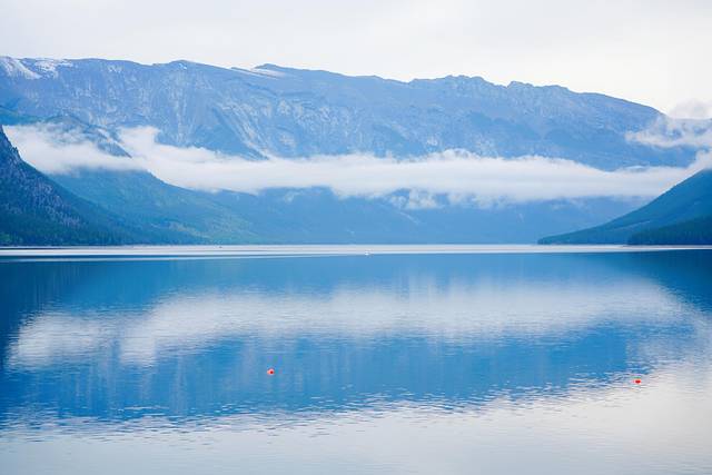 玛琳湖湖面细长,绵延22公里,四面被冰雪覆盖的山脉所环绕,湖水穿过精灵岛,蜿蜒延伸到科罗内特冰川(Coronet Glacier)的融水水道之中。