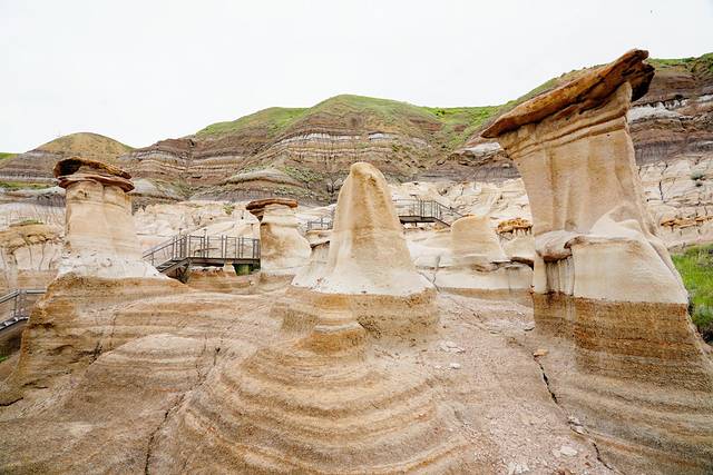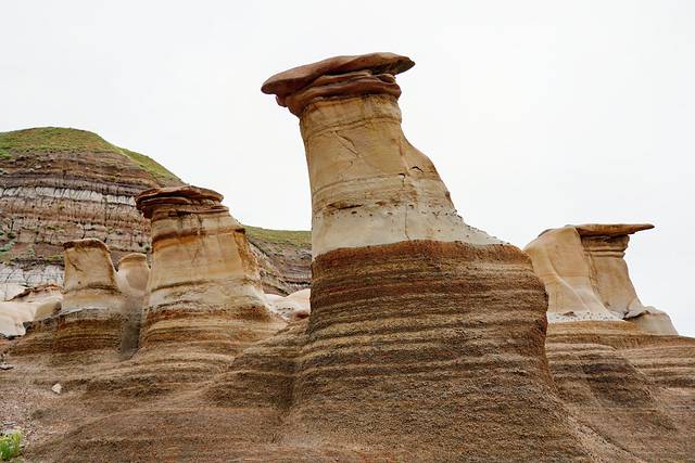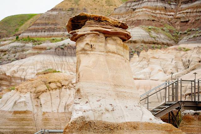 ★取道石林小道(Hoodoo Trail)(10号公路)驶过德兰赫勒以东25公里,来到石林(Hoodoos)所在地,欣赏这些由经侵蚀的砂岩和石灰岩堆叠而成的烟囱型岩柱。原住民相信这些石柱中有着保护神。