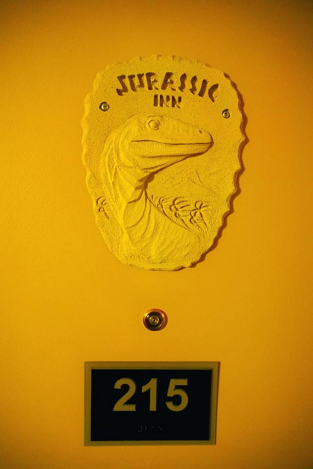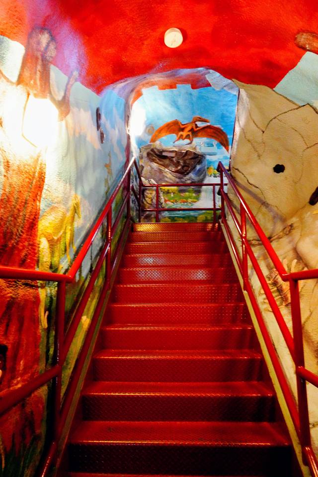 踏着红铜阶梯拾级而上,心中一边默数台阶数,一边欣赏墙壁上当地艺术家Gary Cox创作的以侏罗纪为主题的精美壁画。
