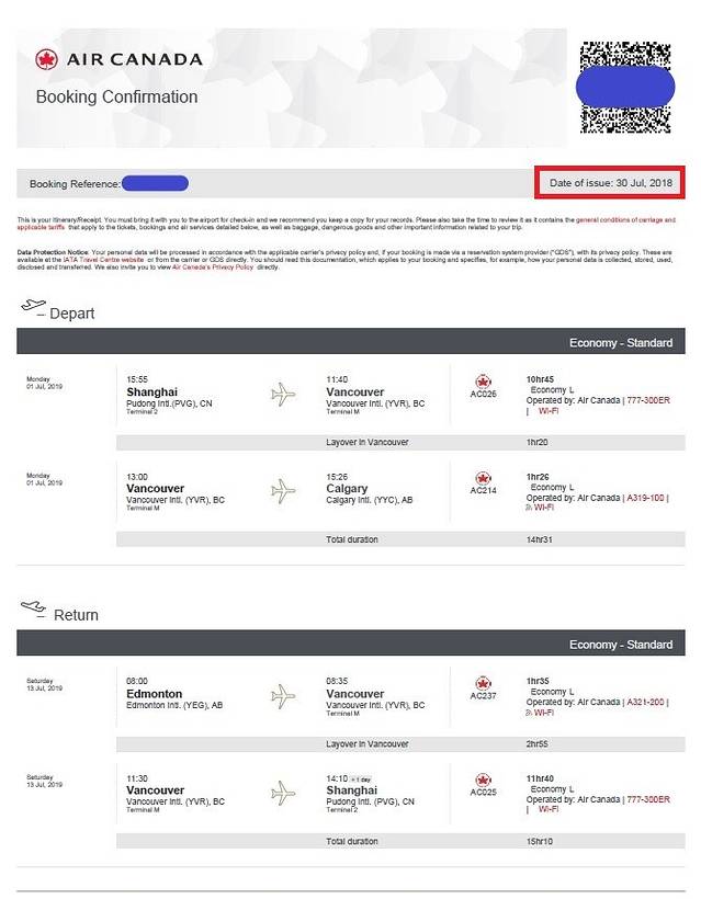 机票要省钱,提早是关键。加航可以提早一年预订机票,我就真的在一年前把机票订好了!是的,你没看错,整整提早了一年,2大1小的价格是13923¥。有人会问,提早这么长时间,万一计划赶不上变化怎么办?我的回答:改或者退。这句看似废话,实则对比过后你就会发现,退或改的成本远小于机票价格的上涨幅度,而且随着时间的推移,这种差距会越来越明显。举个例子,加航退票的费用是200加元/人,改签的费用100加元/人,而机票价格提前半年订已经涨到20000¥,提前三个月是28000¥。哪个划算,只要数学不是体育老师教的,大家都能算明白。