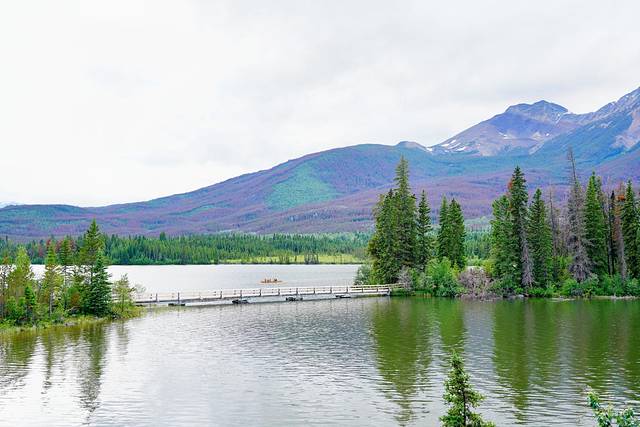 开阔的湖面使得对岸的黄头山谷(Yellowhead Valley)和更远处的雪山一览无余。横贯黄头山谷的加拿大北方铁路(Canadian Northern Railway)于1913年修建完工,正是这条铁路带来的乘客让贾斯珀镇和贾斯珀国家公园得以迅速地发展起来。