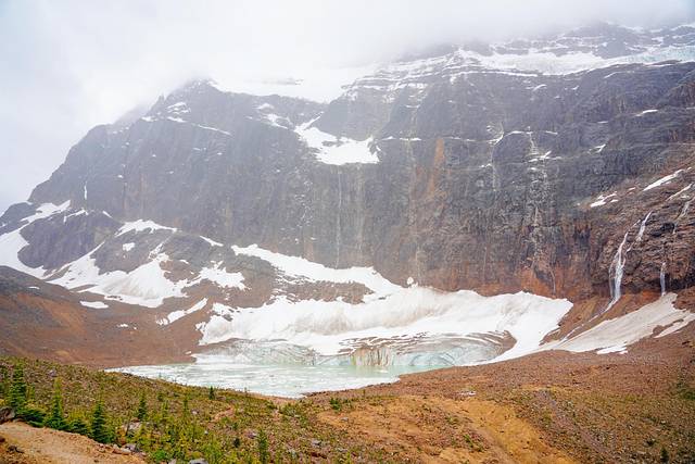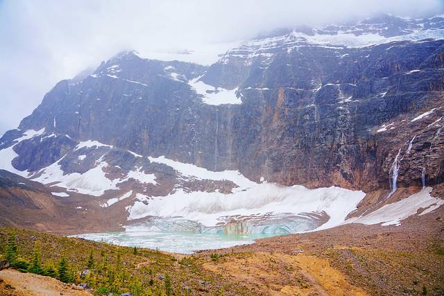 右侧那座表面仿佛刷了一层白漆的山熟悉么?就是上文介绍过的伊迪丝·卡维尔山,天使冰川被最右侧的山给挡住了。