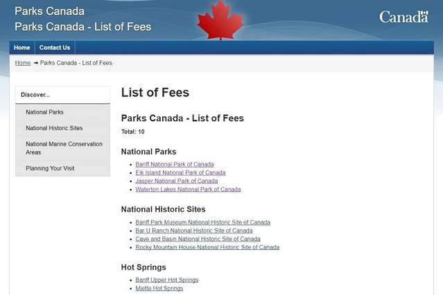 日票只能现场购买,官网仅提供查询功能,不提供订购服务。在List of Fees页面先选择省份(以艾伯塔省为例),查询后该省所有的国家公园、国家历史遗址和温泉会以清单的形式呈现出来,点击进去可以查看价目明细。
