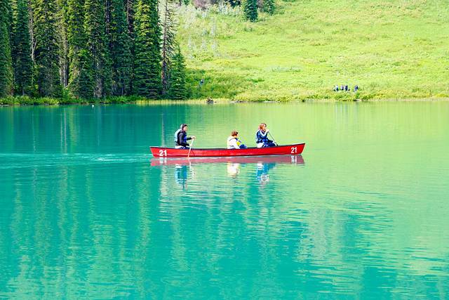 泛舟玛琳湖有两种方式,一种是在湖边红色醒目屋顶的船屋处(营业时间上午9:00-下午4:00)租借皮划艇或划桨船,价格75加元/小时,200加元/天。从船屋划到精灵岛全长14公里,大约需要半天的时间。