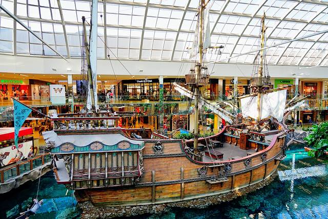 商场一楼西侧的中央是一个大型水池(Deep Sea Adventure Lake),水池里一汪碧水象征着蔚蓝色的大海,水底下的珊瑚、贝壳栩栩如生,这里停放着哥伦布发现美洲大陆的旗舰——圣玛利亚号(Santa Maria)的复制品。