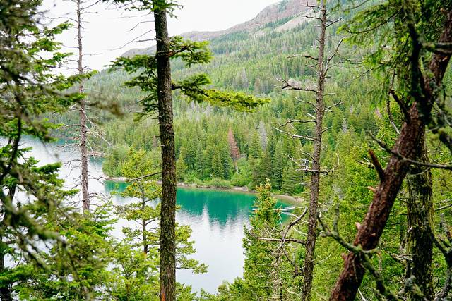 远处是Mount Colin,对岸的游船码头附近有P7停车场,它是金字塔湖区Overlook Loop的步道入口,这条向上攀升的Trail除了能俯瞰金字塔湖,中途还有一处红椅子。