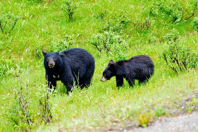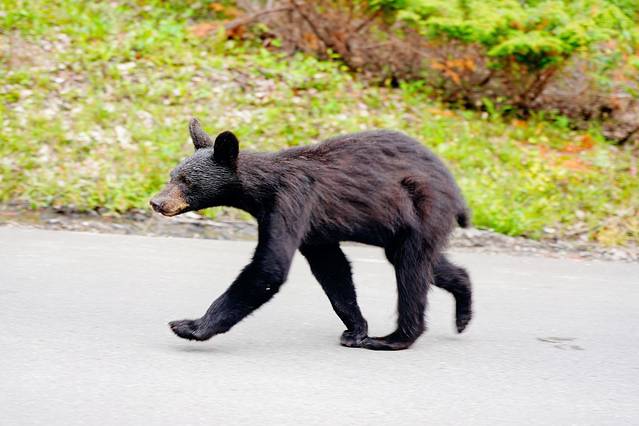 黑熊宝宝快速穿过马路,回到道路另一侧的棕熊妈妈身边。