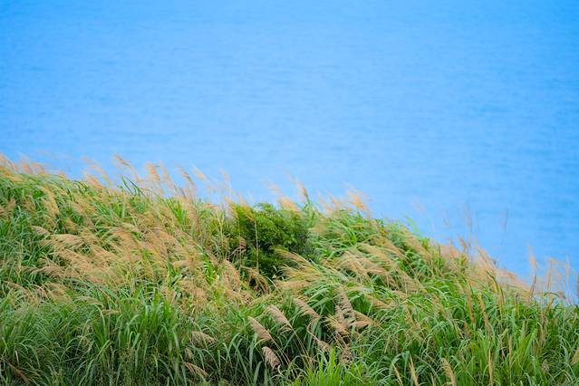 大嵛山岛的风景有一种养在深闺人未识的感觉。当接我们的巴士载着我们穿梭在岛上的羊肠小路上,车窗外的风景渐渐地丰富了起来。沿途摇曳的芦苇,如同岛上热情的岛民向我们招手,欢迎远道而来的旅人。当初的失望也正渐渐的消失,取而代之的是对这个陌生的岛屿浓郁的求知欲。