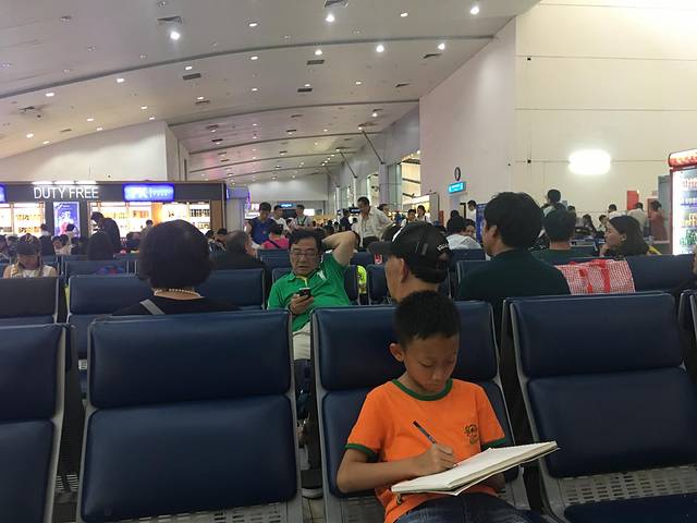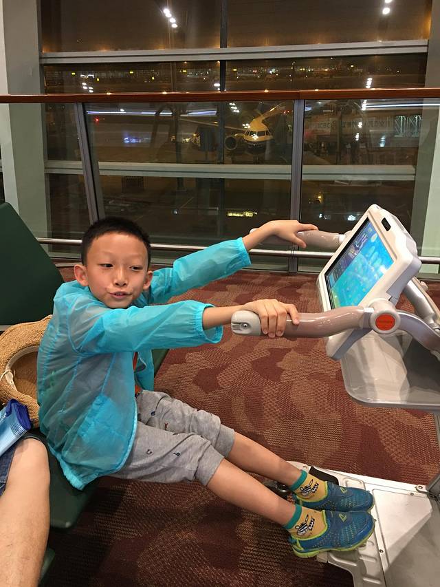 飞机晚点了,明显晒黑了,等待登机时儿子正在用他自己的方式记录这次旅行。