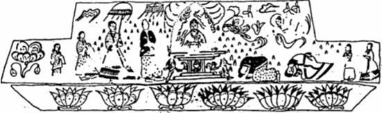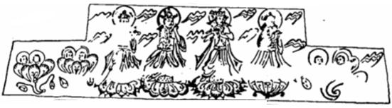 山炉,左右有白狮,夫妻俯伏跪拜,四周有飞天、流云和莲花。