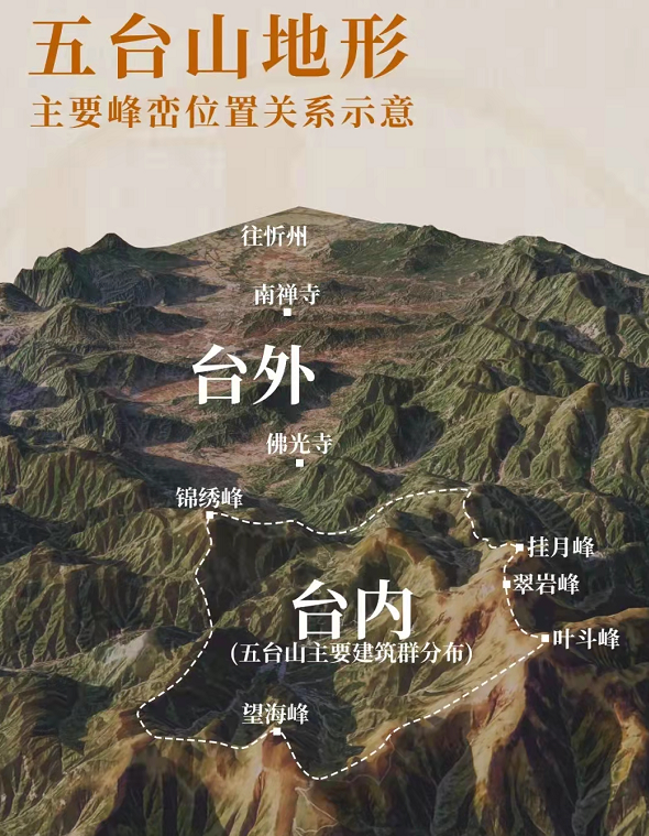 中台翠岩峰,对应演教寺和孺童文殊;西台挂月峰,对应法雷寺和狮子吼文殊;南台锦绣峰,对应普济寺和智慧文殊。