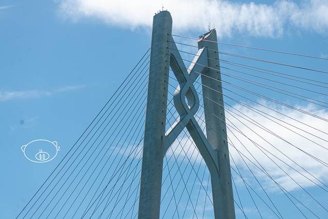 “风帆”双塔是九洲航道桥,两座相当于30层楼的风帆型的塔柱,耸立在南海岸畔, 象征着伶仃洋上粤港澳三地通力合作建设港珠澳大桥,寓意“扬帆起航,一帆风顺”。
