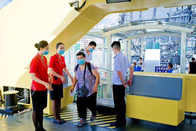登船啦,在工作人员热情引导下,终于登上“大黄蜂”,有儿童、老人登船,工作人员都会提示注意并搀扶,态度非常友好。