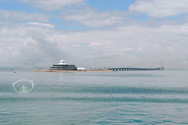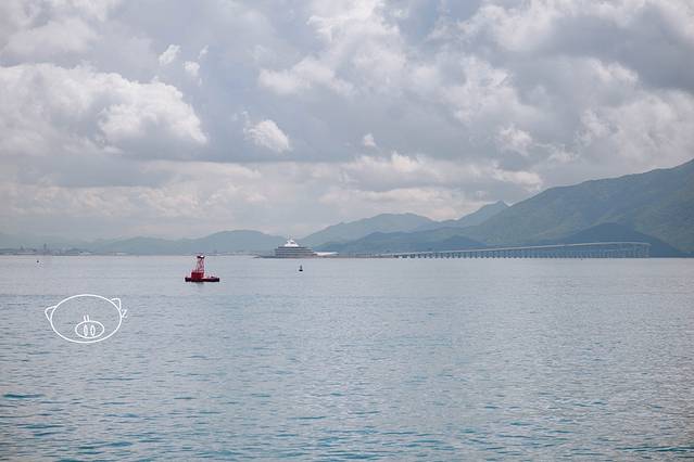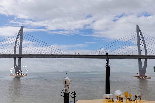 四层是360°全景露天观光平台,在这可以观景拍照、登高望远。甲板上配有圆台和高脚椅,可以坐着,拿上一杯饮料,吹着爽爽的海风看海景。嘻嘻,小猪已占领有利位置,看着外面的海上的船只和远处的港珠澳大桥了。
