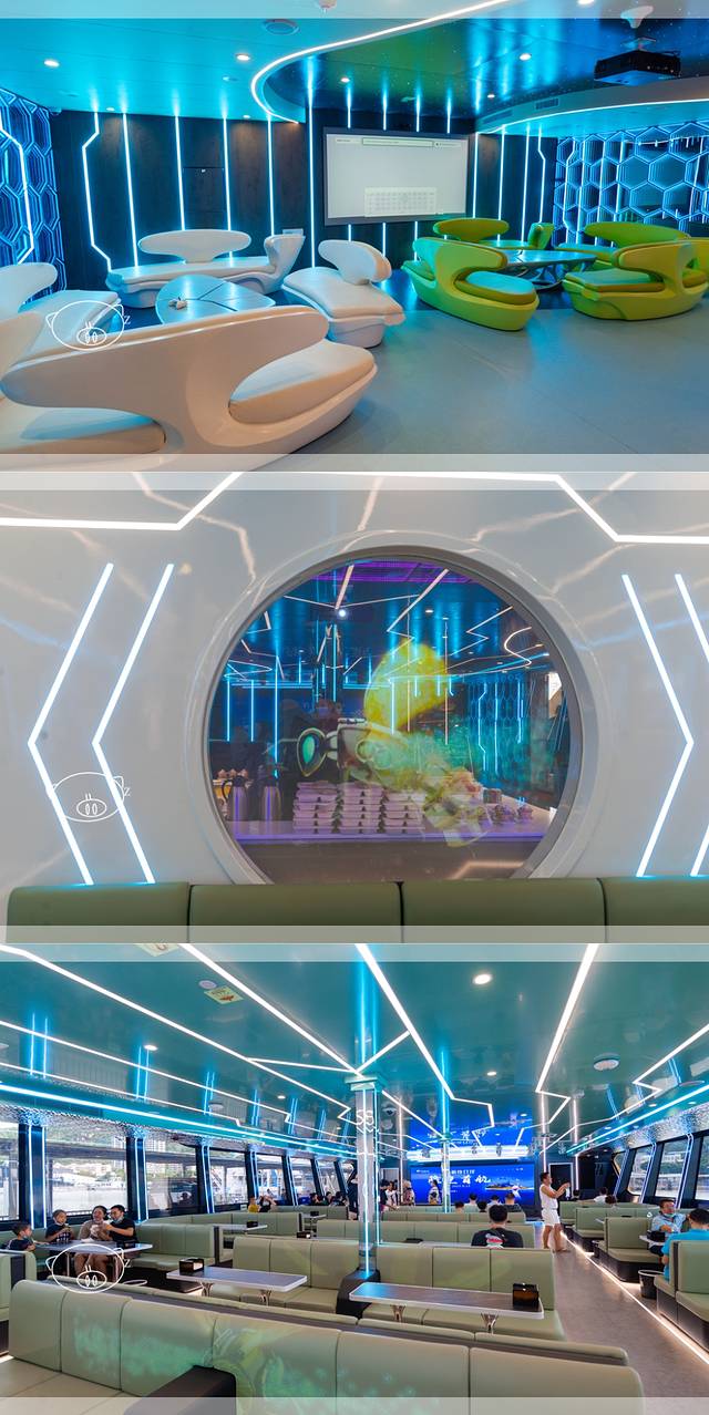“大黄蜂”共分为四层,一层是舒适客座区,线型深渊灯与船体相融,船舱未来科技感十足。船内声、光、电、LED设施齐全,服务到位,免费对游客开放体感游戏体验及观看震撼大片。一层的玻璃窗是全封闭的,不过能通过通透的大玻璃看到外面的美景,下雨天、大热天等,也可以坐在舱内欣赏海上风光。